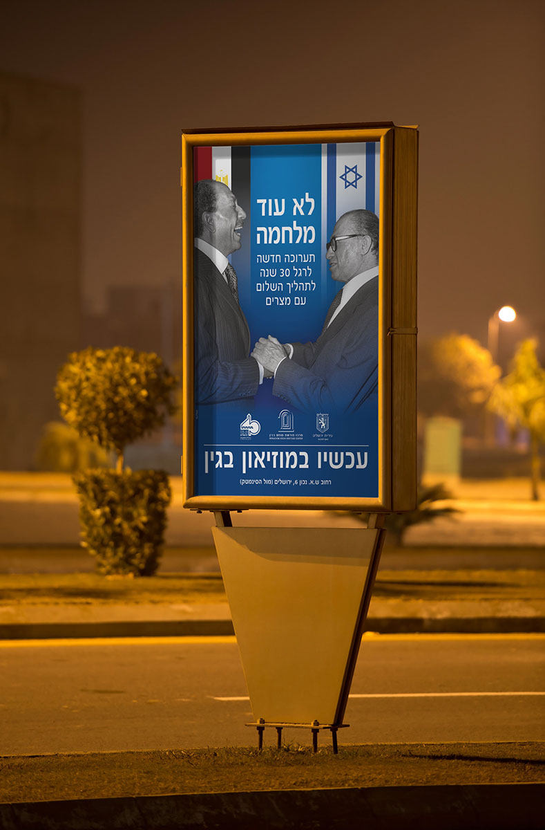 מרכז מורשת מנחם בגין הקים תערוכה לציון שלושים שנה להסכם השלום עם מצרים. לבקשתם עוצב שלט ״רול-אפ״ ושלטי חוצות שנתלו ברחבי ירושלים. בעיצוב נעשה שימוש בחומר ארכיוני שהיה ברשות מרכז בגין. התמונה שנבחרה, מטרתה היתה לשדר אופטימיות ותקווה להמשך.